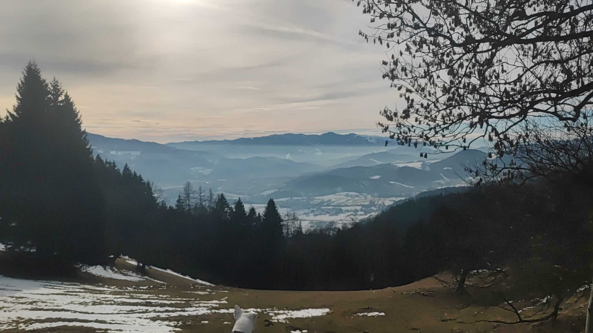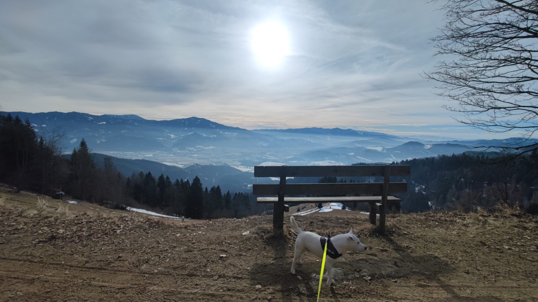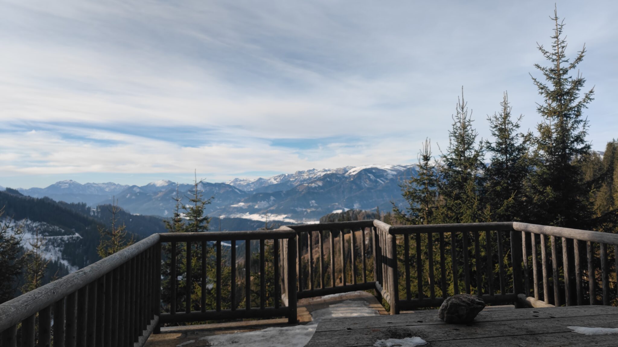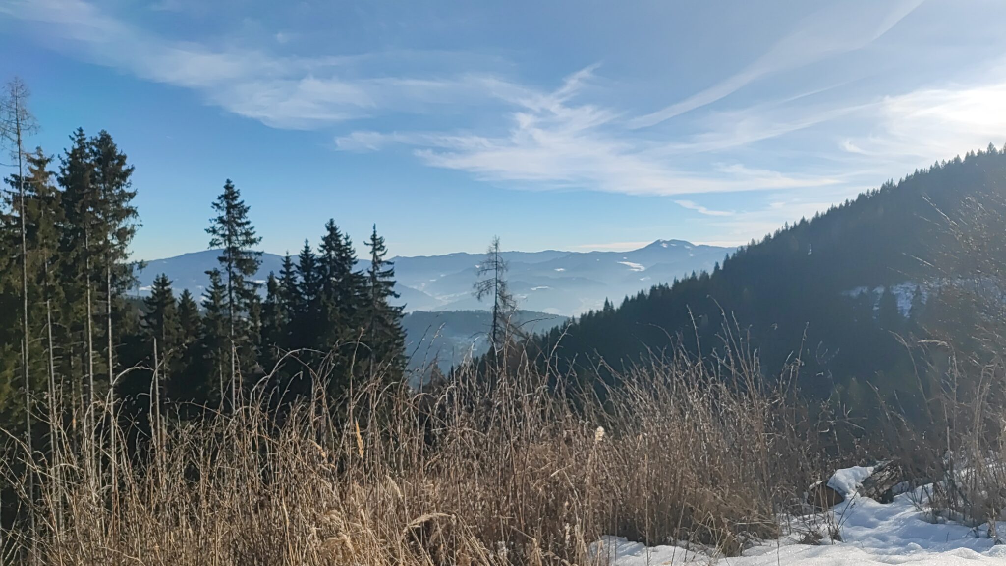 Noch bevor ich zur Weltkugel komme, wartet eines der ersten großen Highlights dieses Abschnitts: die längste Bank Österreichs. Ganze 100 Meter lang zieht sie sich hier oben durch die Landschaft. Kein Gag, kein Symbol – einfach eine richtig lange Bank. Und genau das macht sie so gut. Man setzt sich hin, rutscht vielleicht ein Stück weiter, schaut wieder, bleibt nochmal sitzen. Von hier aus öffnet sich ein richtig schönes Panorama über das Mürztal, hinunter nach St. Lorenzen, St. Marein und weiter bis nach Kapfenberg. Gerade im Winter, wenn das Licht flach steht und ein leichter Dunst in der Luft liegt, wirkt das fast ein bisschen wie ein Naturkino.
