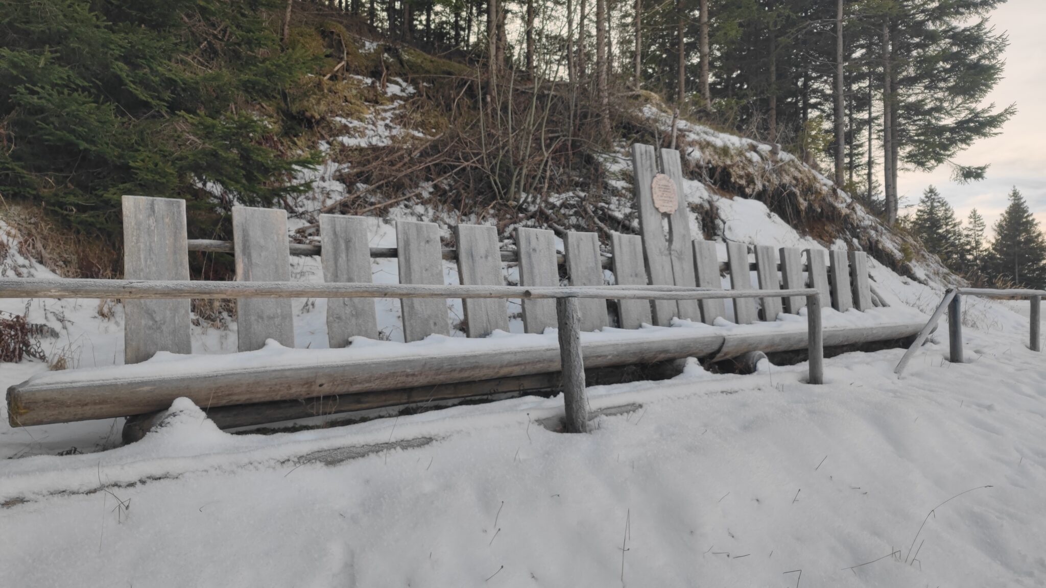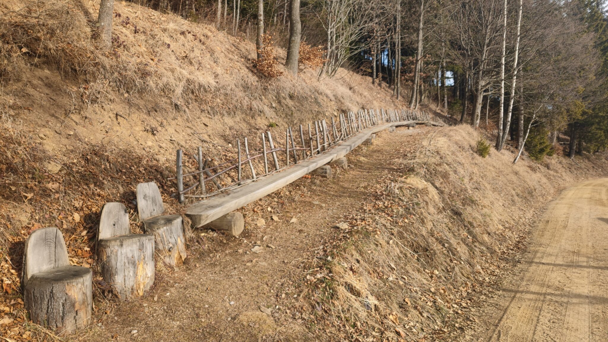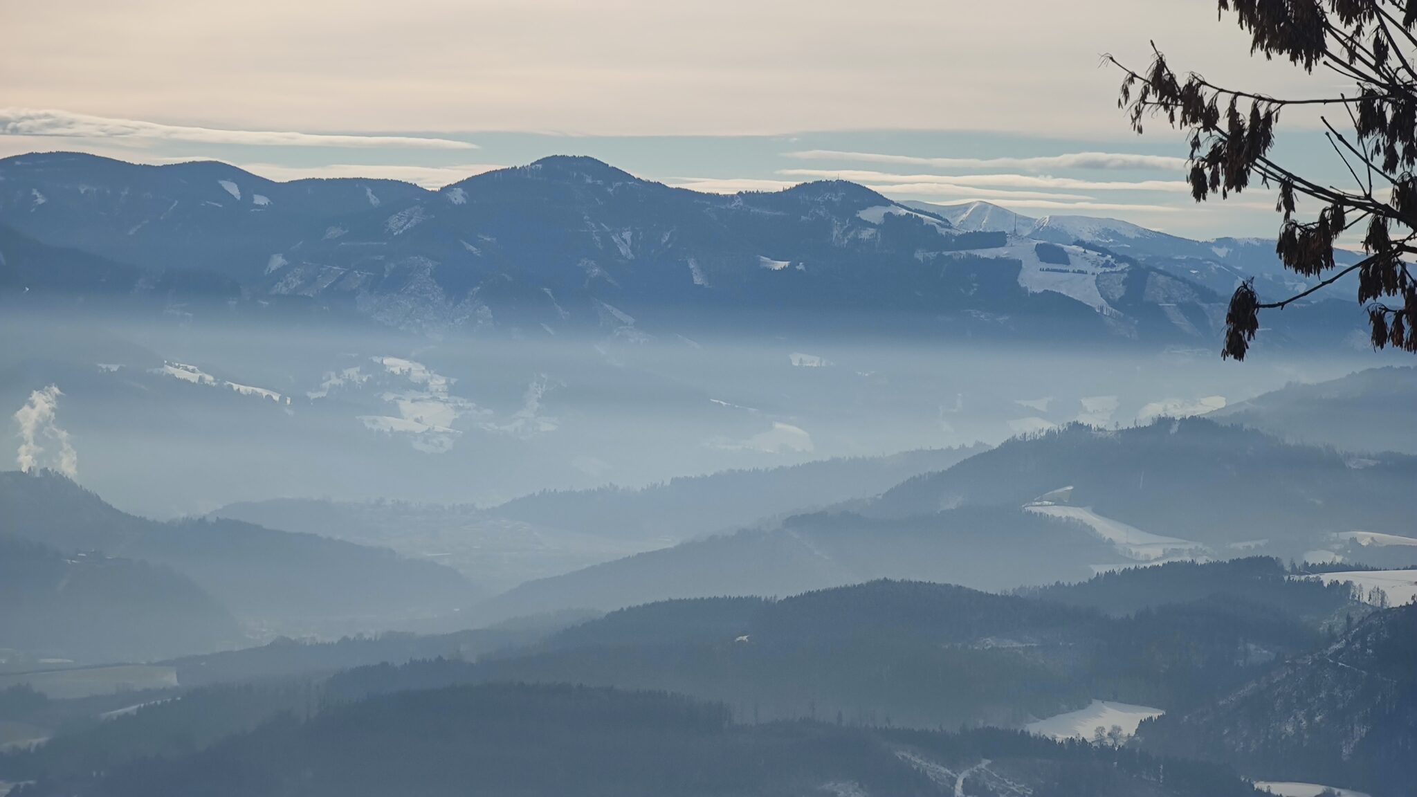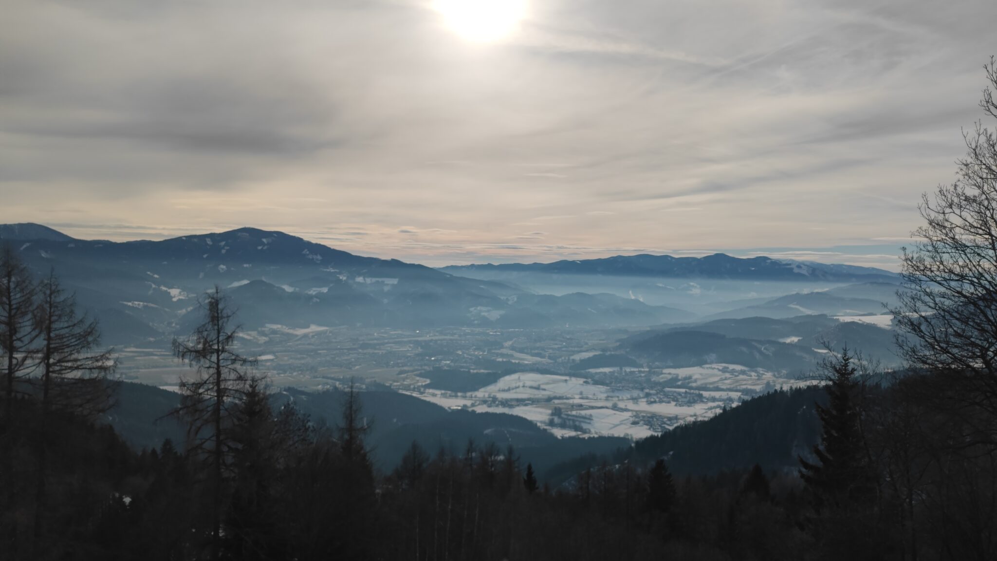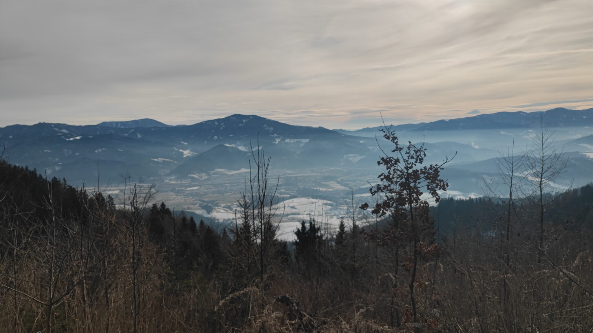 Noch bevor ich zur Weltkugel komme, wartet eines der ersten großen Highlights dieses Abschnitts: die längste Bank Österreichs. Ganze 100 Meter lang zieht sie sich hier oben durch die Landschaft. Kein Gag, kein Symbol – einfach eine richtig lange Bank. Und genau das macht sie so gut. Man setzt sich hin, rutscht vielleicht ein Stück weiter, schaut wieder, bleibt nochmal sitzen. Von hier aus öffnet sich ein richtig schönes Panorama über das Mürztal, hinunter nach St. Lorenzen, St. Marein und weiter bis nach Kapfenberg. Gerade im Winter, wenn das Licht flach steht und ein leichter Dunst in der Luft liegt, wirkt das fast ein bisschen wie ein Naturkino.