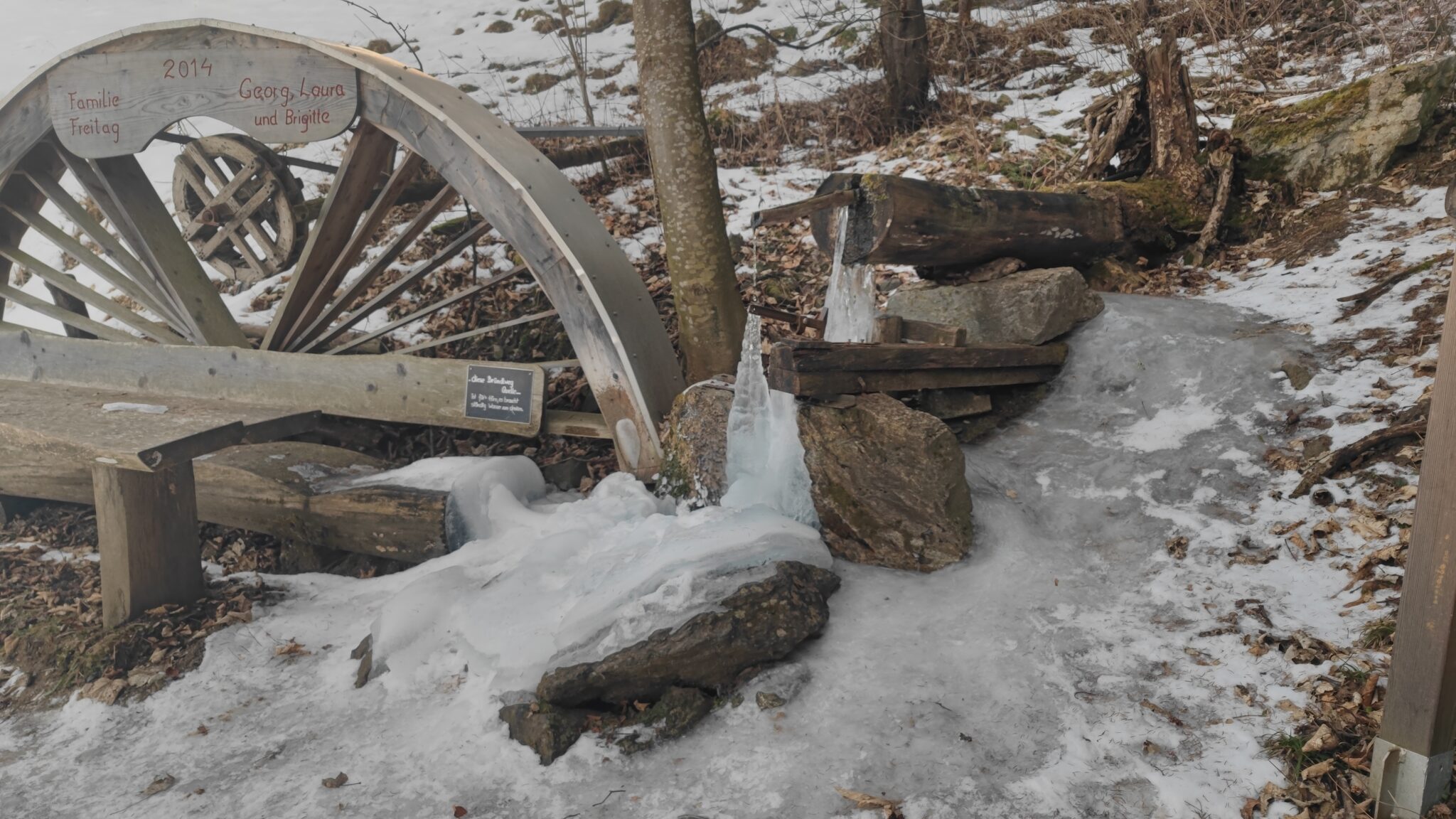Kurz danach kommt ein kleiner Teich mit Trittsteinen und einem Tisch mitten im Wasser. Der Barfußweg. Im Winter ist alles zugefroren, wirkt aber fast schon märchenhaft. Man merkt hier sehr schnell, dass der Bründlweg ursprünglich als Erlebnisweg gedacht ist und nicht nur als klassischer Wanderpfad.
