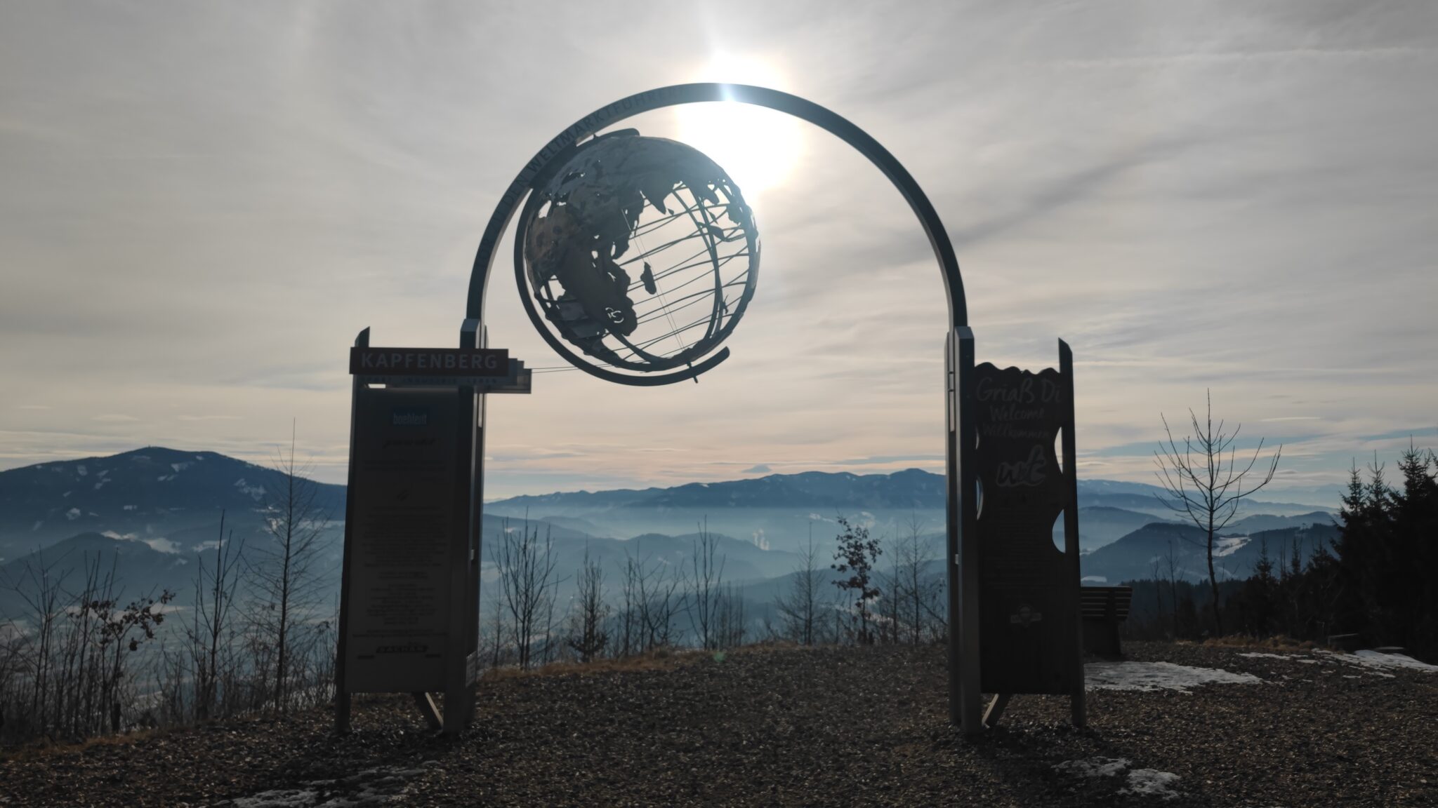 Ich bleibe auf dem Bründlweg und erreiche wenig später den nächsten markanten Punkt: die Weltkugel – das „Tor zum Weltmarktführer“. Sie steht hier oben mit freiem Blick Richtung Kapfenberg und wirkt fast ein bisschen wie ein Orientierungspunkt zwischen Wald und Weite. Rundherum gibt es Sitzgelegenheiten und sogar einen kleinen Spielplatz. Mitten im Wald ist das ein Platz, mit dem man so nicht rechnet – und genau deshalb bleibt man hier automatisch ein bisschen länger stehen.