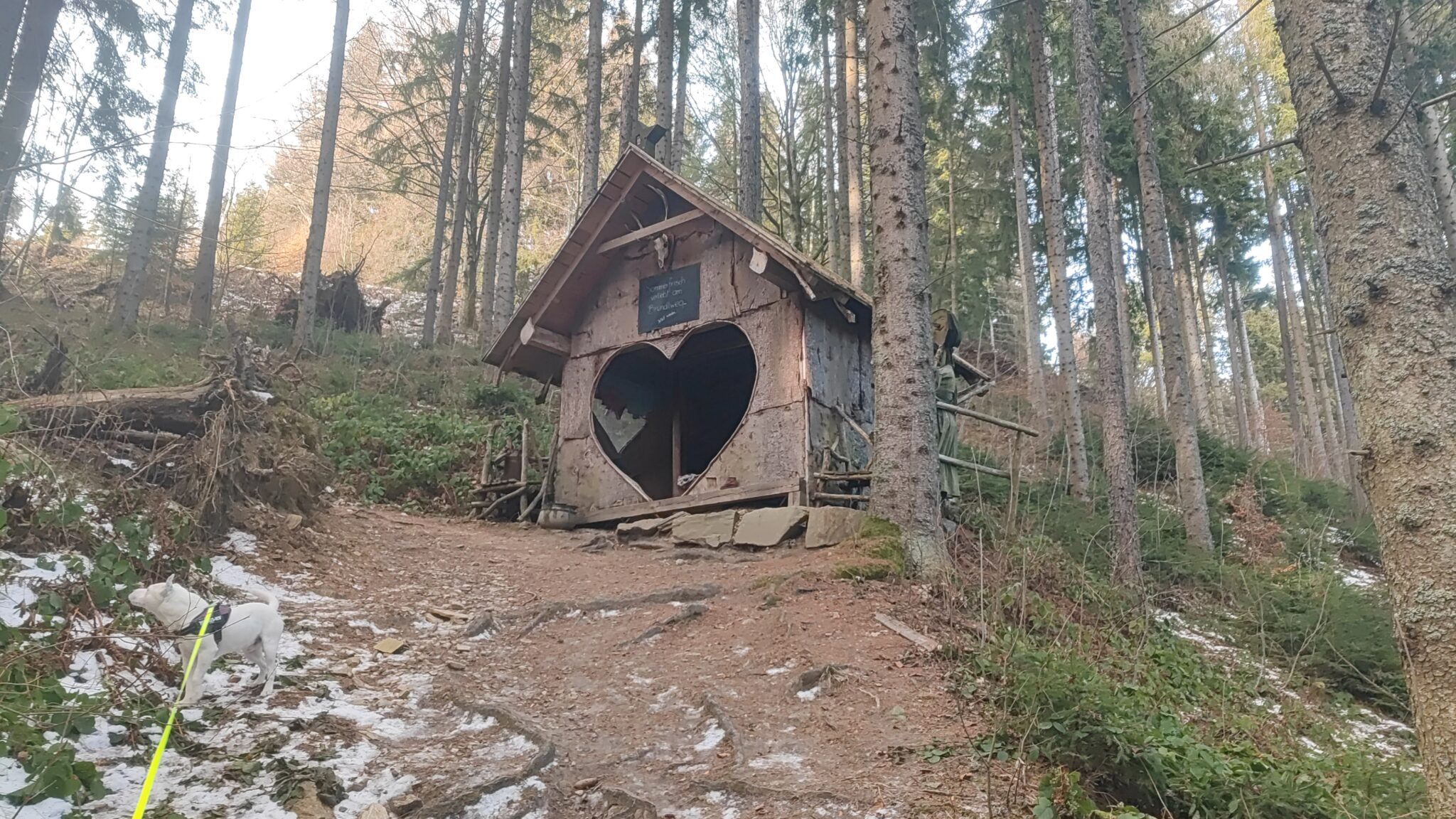 Danach wartet der letzte kurze Anstieg. Wirklich nichts Dramatisches und schnell erledigt. Auf dem Weg nach oben komme ich an der Herzerlhütte vorbei. Eine kleine Hütte mit herzförmigem Eingang und einem gemütlichen Bett im Inneren. Sie lädt definitiv dazu ein, die Schuhe auszuziehen und sich kurz hinzulegen. Da ich allerdings alleine mit Coke unterwegs bin – und diese Hütte doch eher für liebende Paare gedacht ist – spare ich mir das Hinlegen und gehe weiter.