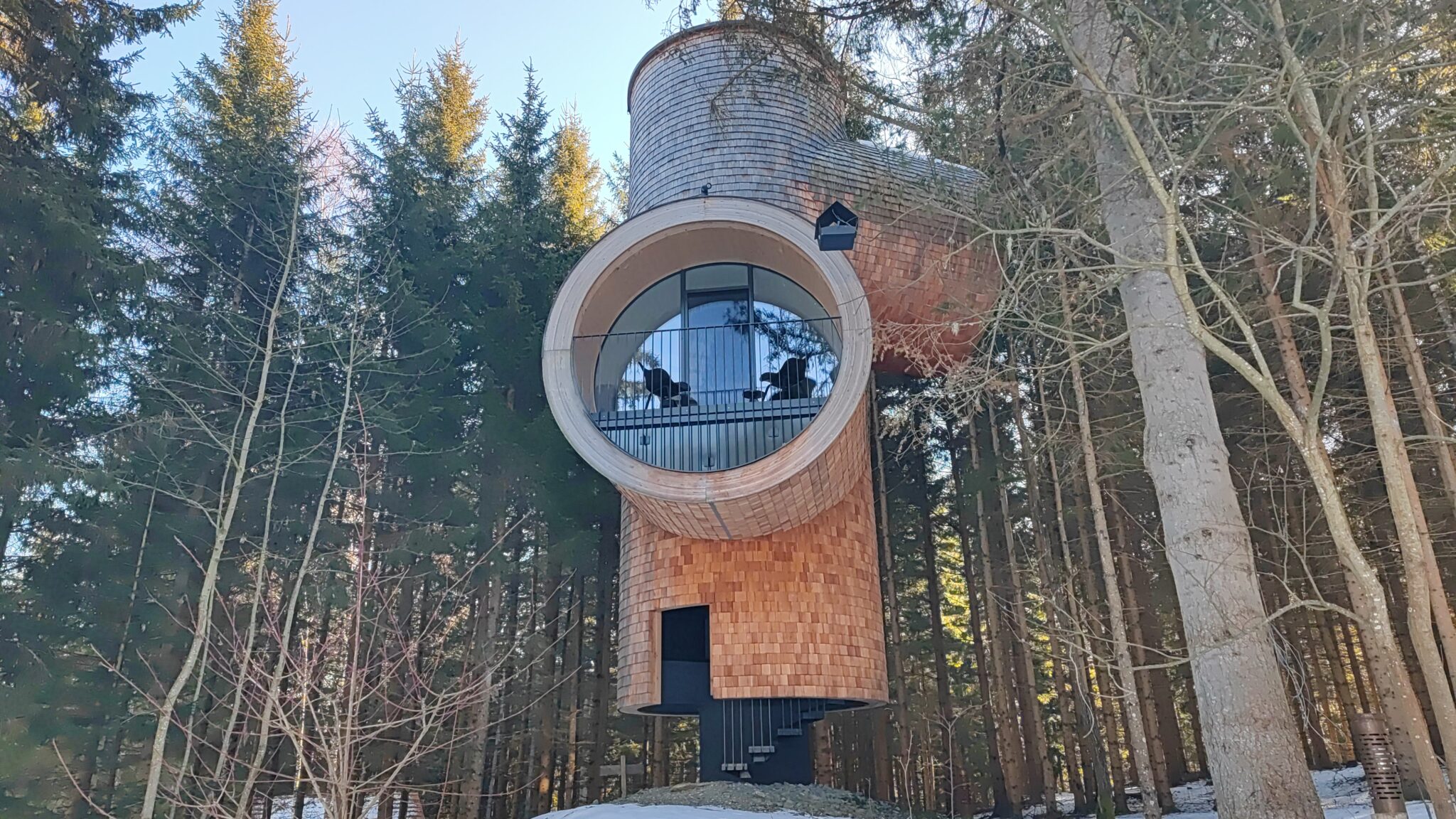 Wenig später steht das erste von vier futuristischen Baumhäuser des Wirtshauses Steirereck. Das Gebäude fällt sofort auf, weil es rund gebaut ist und mit seinem großen runden Fenster eher an einen riesigen Rauchfang mit Bullauge erinnert als an ein klassisches Baumhaus. Es kann tatsächlich gebucht werden und funktioniert wie ein kleines Apartment mitten im Wald.