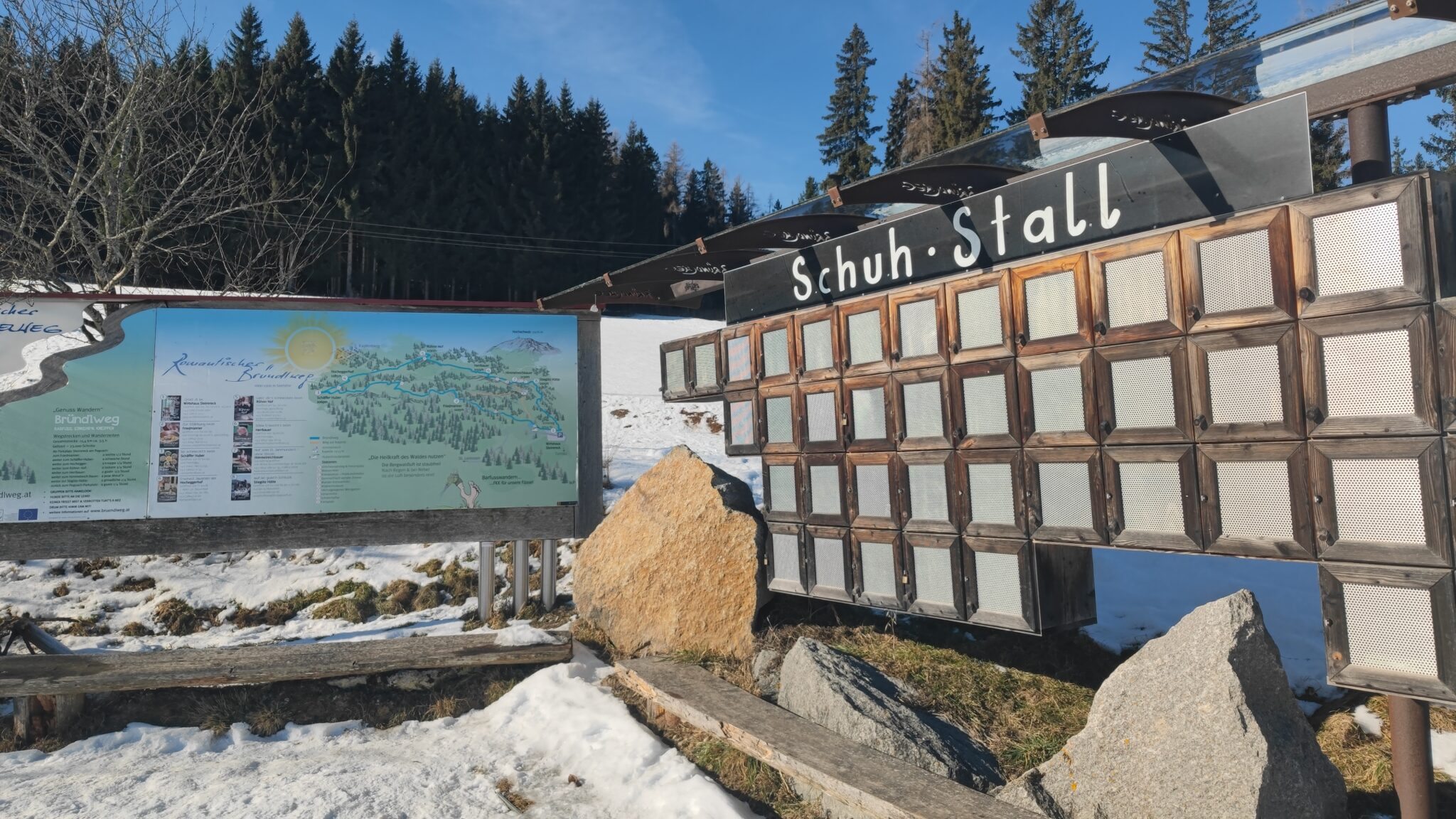 Noch bevor man überhaupt richtig losgeht, steht dort ein Schuhstall, der dazu einlädt, seine Schuhe abzustellen und den Weg barfuß zu beginnen. Im Sommer sicher eine nette Idee, im Winter für mich allerdings keine Option. Da braucht es gutes Schuhwerk und, je nach Bedingungen, auch Grödel.